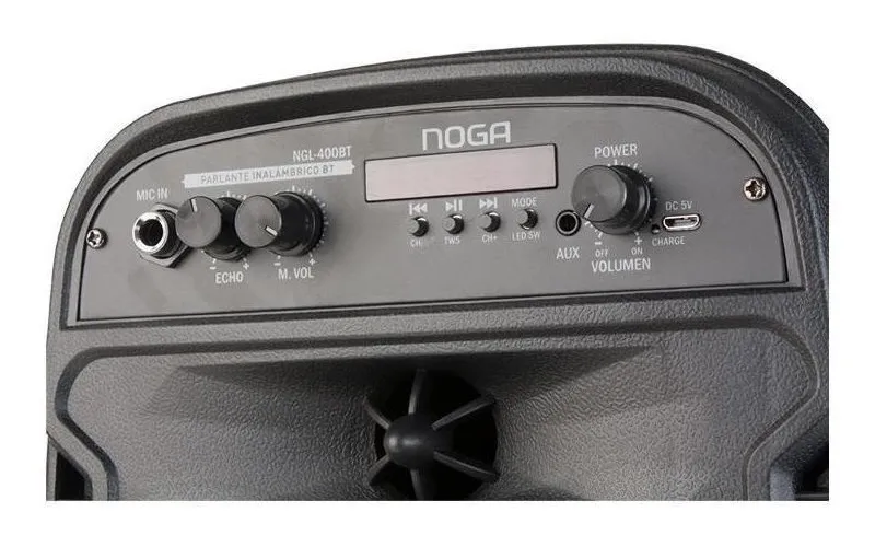 Noga NGL-400BT ofrece un sonido natural, con una gran claridad y precisión, que se dispersa de manera uniforme. Un parlante que asegura potencia y calidad por igual en la reproducción de contenidos multimedia. Olvidate del amplificador Al ser activo solo necesitarás conectarlo a la fuente de sonido y el mismo equipo se encargará de amplificar y reproducir: ganarás practicidad y espacio, ya que además requiere menos cableado que uno pasivo. Es la solución más conveniente si querés producir música en tu casa o en un estudio, y también para DJs. Apto para aire libre Usalo en donde quieras, este dispositivo está diseñado para que tengas el mejor sonido siempre, tanto en interiores como en exteriores. - Potencia 75W - Posee 1 Parlante de 6 pulgadas con LED RGB Dinámico con efectos lumínicos - Recepción Inalámbrica BT con alcance de hasta 10 metros - No tiene RADIO - No tiene ENTRADA PARA PEN - Display Digital - Entrada de Micrófono plug 6.5 mm para Función Karaoke - Controles de Echo y Volumen para Micrófono - Controles Anterior-Play/Pause-Siguiente & Mode LED SW - Power ON/OFF & Volumen - LED indicador de carga - Puerto micro USB/DC5V para recarga de Batería (incluye cable) - Funciona con Bateria recargable de Litio de 800mAH - Manija para transportarlo - Orificio de encastre para usarlo como columna - Medidas: 31 cm. (Alto) x 20 cm. (Ancho) x 14,5 cm. (Profundidad)